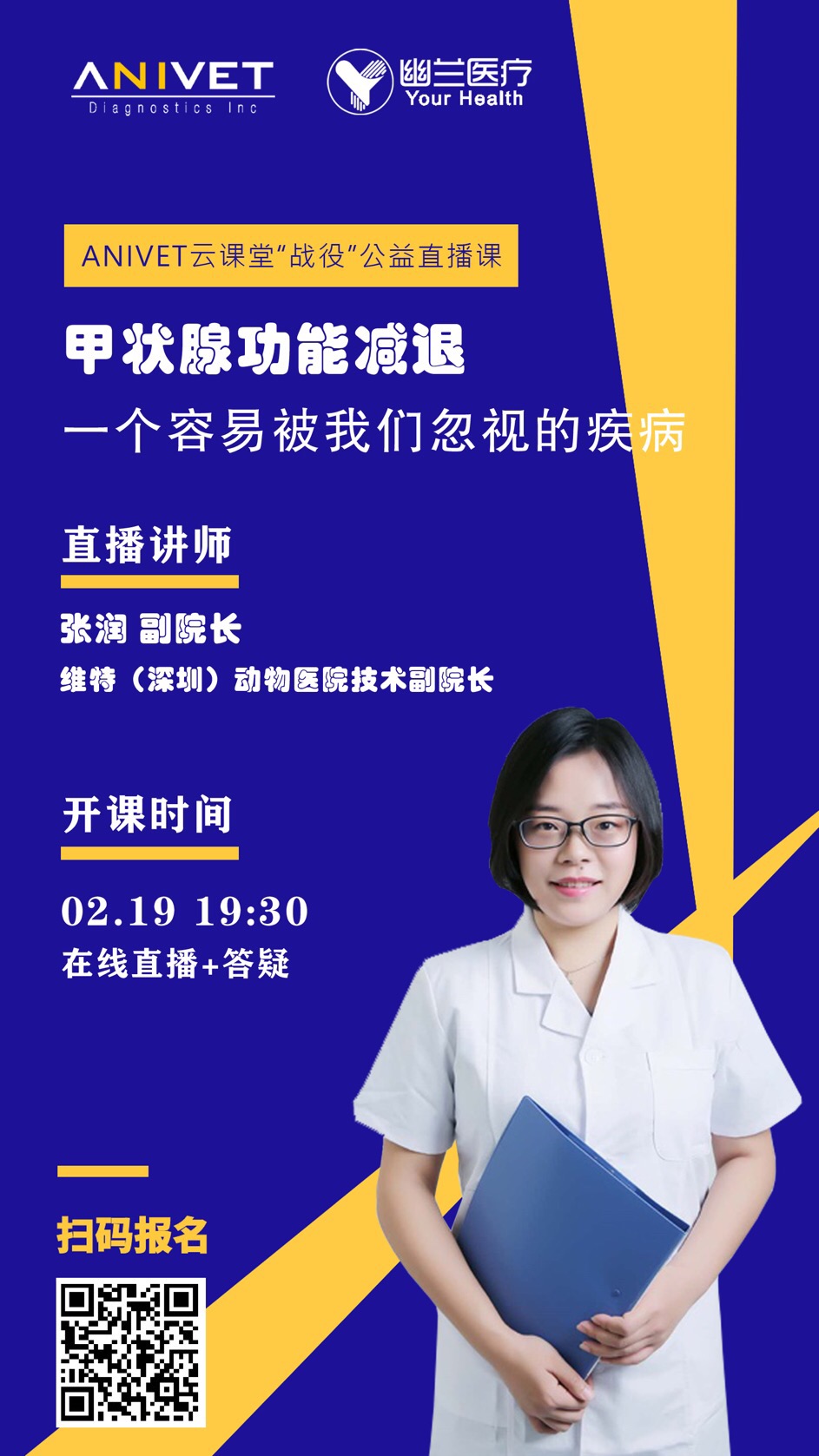 2020년2월19일(수) 20시30분, 애니벳은 워이터동물병원(중국, 심천) Zhang Run부원장님을 모셔서 “개, 고양이 갑상선기능저하증”이란 제목으로 2020년의 첫 인터넷강의를 개강하게 됩니다.
